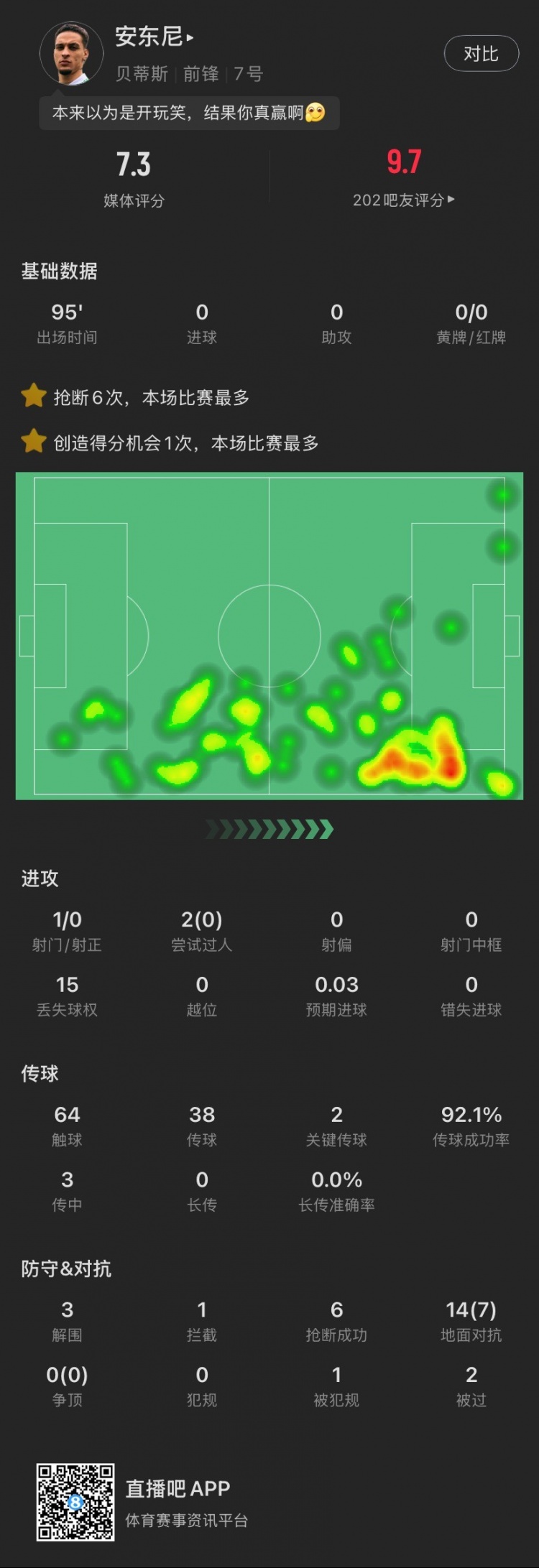 3月2日訊 在剛剛結(jié)束的西甲第26輪比賽中,貝蒂斯主場2-1擊敗皇馬。本場比賽,安東尼打滿全場,獲評了7.3分。