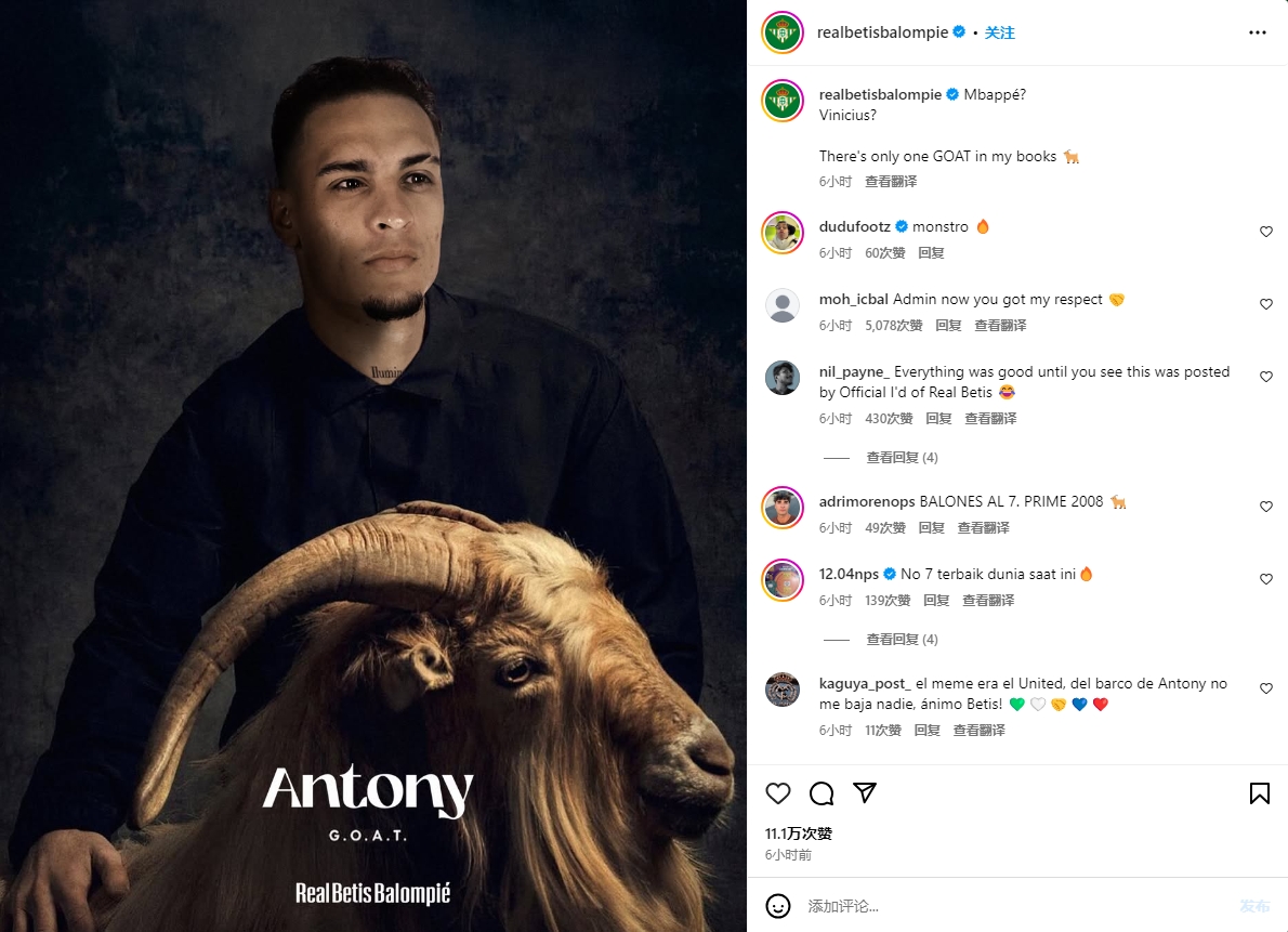 賽后,貝蒂斯官方曬出安東尼與山羊(GOAT)的P圖,配文:“姆巴佩?維尼修斯?我的字典里只有一位GOAT????