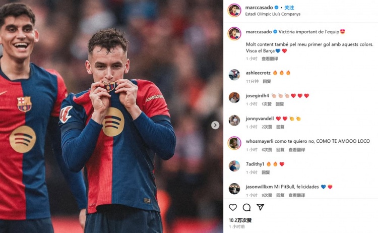 卡薩多也通過社媒曬出自己親吻隊徽的照片,并配文:“球隊拿下重要的勝利!我非常高興能夠打進(jìn)巴薩生涯處子球,巴薩萬歲!”