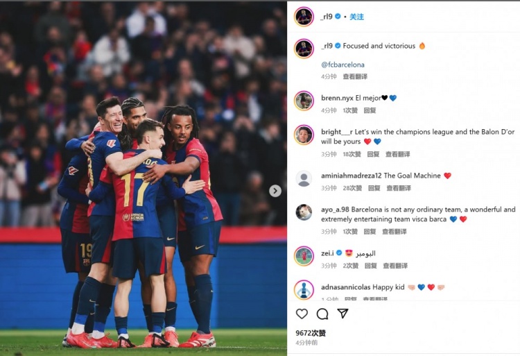 萊萬本賽季37場已經打進33球,他也在賽后通過社媒曬出自己和隊友們相擁慶祝的合照,并配文:“保持專注,贏得勝利@巴薩俱樂部”。