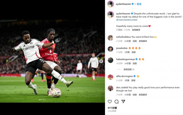 他也在賽后通過社媒曬出自己的比賽照,并配文:“盡管結(jié)果并不理想,但我很高興能夠為這家世界最大俱樂部之一完成首秀。@曼徹斯特聯(lián)俱樂部,希望未來能夠有更多出場機會?!?/p>