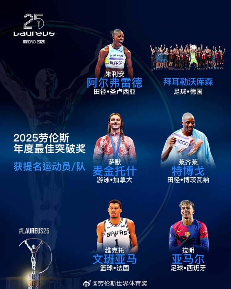 3月3日訊 官方消息,2025勞倫斯世界體育獎“年度最佳突破獎”提名,勒沃庫森、亞馬爾、文班亞馬入圍,去年這一獎項的獲獎?wù)呤怯⒏裉m足球運動員貝林厄姆。