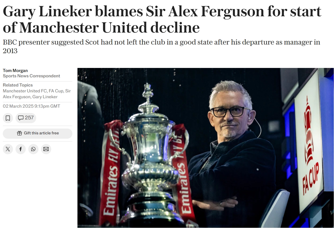 03月03日訊 英格蘭名宿、評論員萊因克爾在評述時表示,曼聯(lián)如今衰落的原因可以追溯到2013年弗格森的離任。
