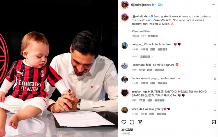 賴因德斯通過社媒曬出自己帶著孩子在續(xù)約合同上簽字的照片,并配文:“很感激能夠和這家非凡的俱樂部完成續(xù)約,非常期待未來幾年繼續(xù)為米蘭效力?!?/p>