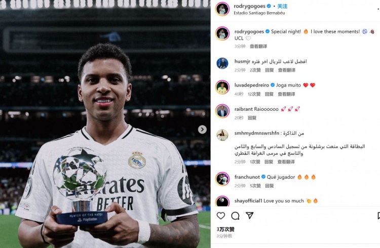 羅德里戈在賽后被歐冠官方評為本場最佳球員,他也通過社媒曬出自己手捧獎杯的照片,并配文:“特別的夜晚!我愛這樣的時刻!??????????歐冠”