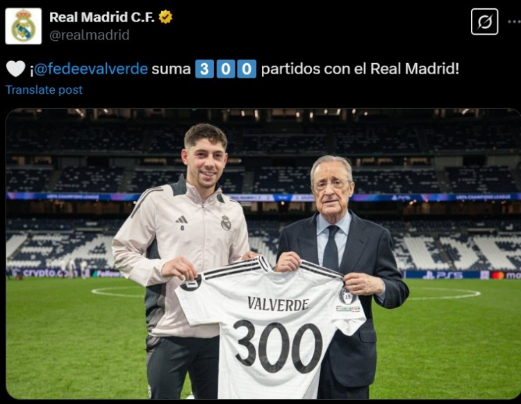 巴爾韋德也獲贈印有300號的定制球衣,并與主席弗洛倫蒂諾合影留念?;蜀R官推也曬出雙方合影,配文寫道:“巴爾韋德在皇馬的300場比賽?!?/p>