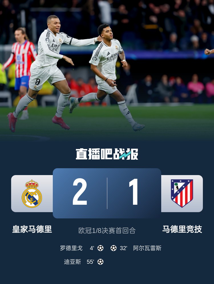 歐冠1/8決賽首回合,皇馬2-1馬競(jìng),占據(jù)晉級(jí)先機(jī)。上半場(chǎng),巴爾韋德助攻羅德里戈內(nèi)切擺脫防守破門,阿爾瓦雷斯過(guò)掉卡馬文加后世界波扳平;下半場(chǎng),卜拉欣-迪亞斯禁區(qū)內(nèi)蝴蝶穿花步過(guò)人后建功。