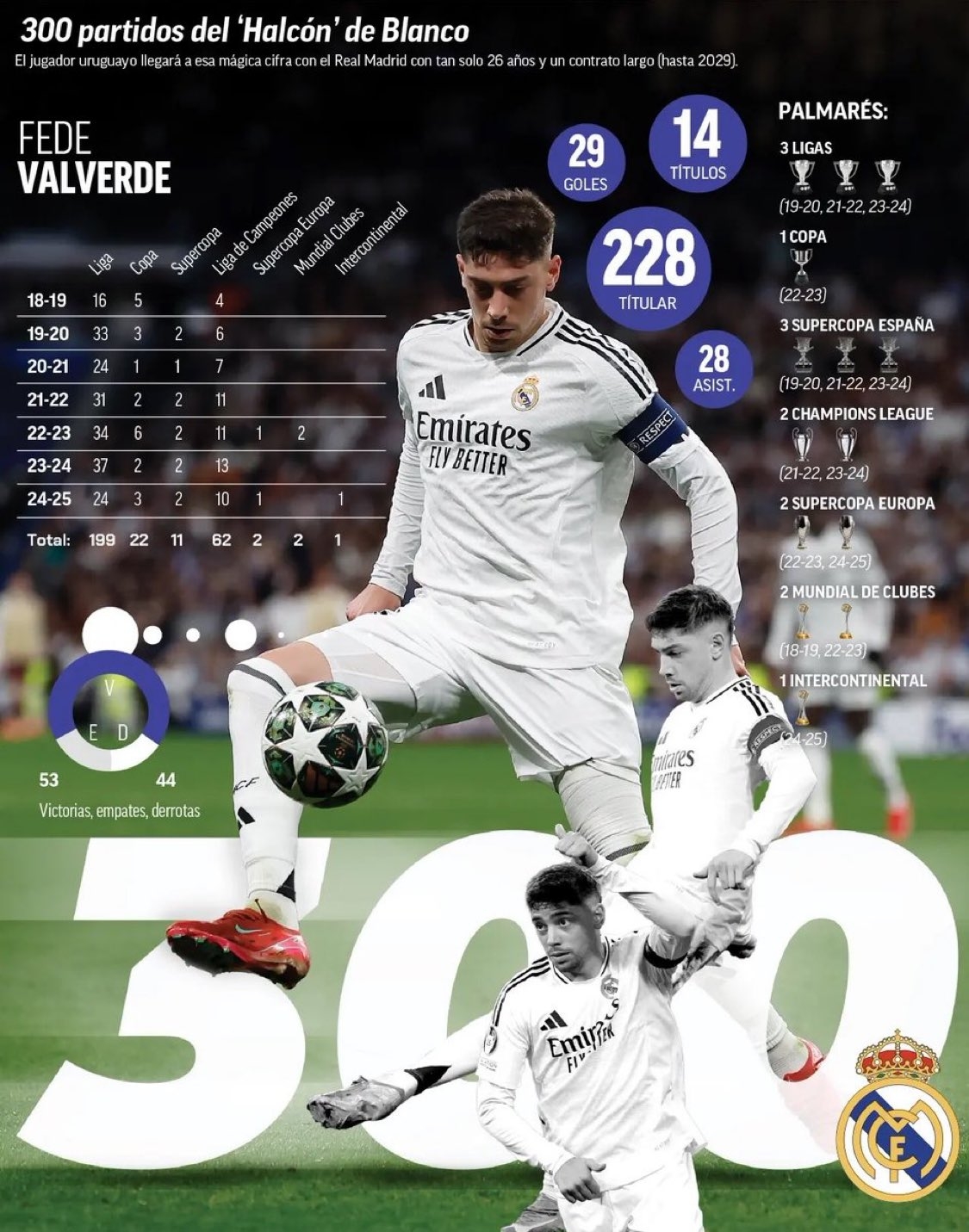 巴爾韋德達(dá)成皇馬生涯300場里程碑,同期29球28助攻+14冠軍