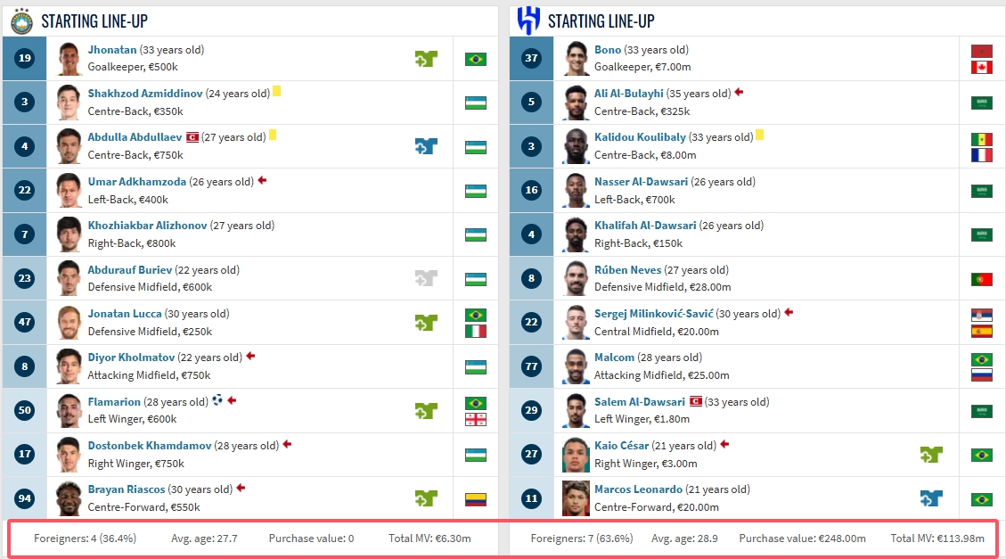 新月首發(fā)身價(jià)1.1398億歐,塔什干棉農(nóng)首發(fā)身價(jià)630萬歐,外援人數(shù)7-4!