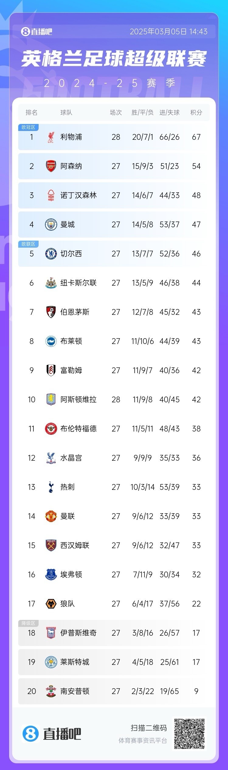 隨著2024/25賽季英超聯(lián)賽進(jìn)入最后三個(gè)月,歐戰(zhàn)資格的爭奪可謂是精彩紛呈。目前排名第三的諾丁漢森林與排名第十的阿斯頓維拉僅有6分差距,不過維拉多賽一場。