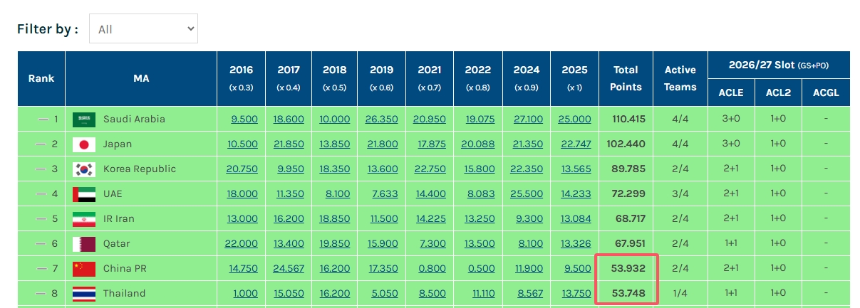 這也意味著中國參加26/27賽季的亞足聯(lián)賽事名額從2+1+1降為1+1+1(一支直通亞冠精英正賽+1個(gè)亞冠精英附加賽+1支直通亞冠二級(jí)聯(lián)賽正賽)。