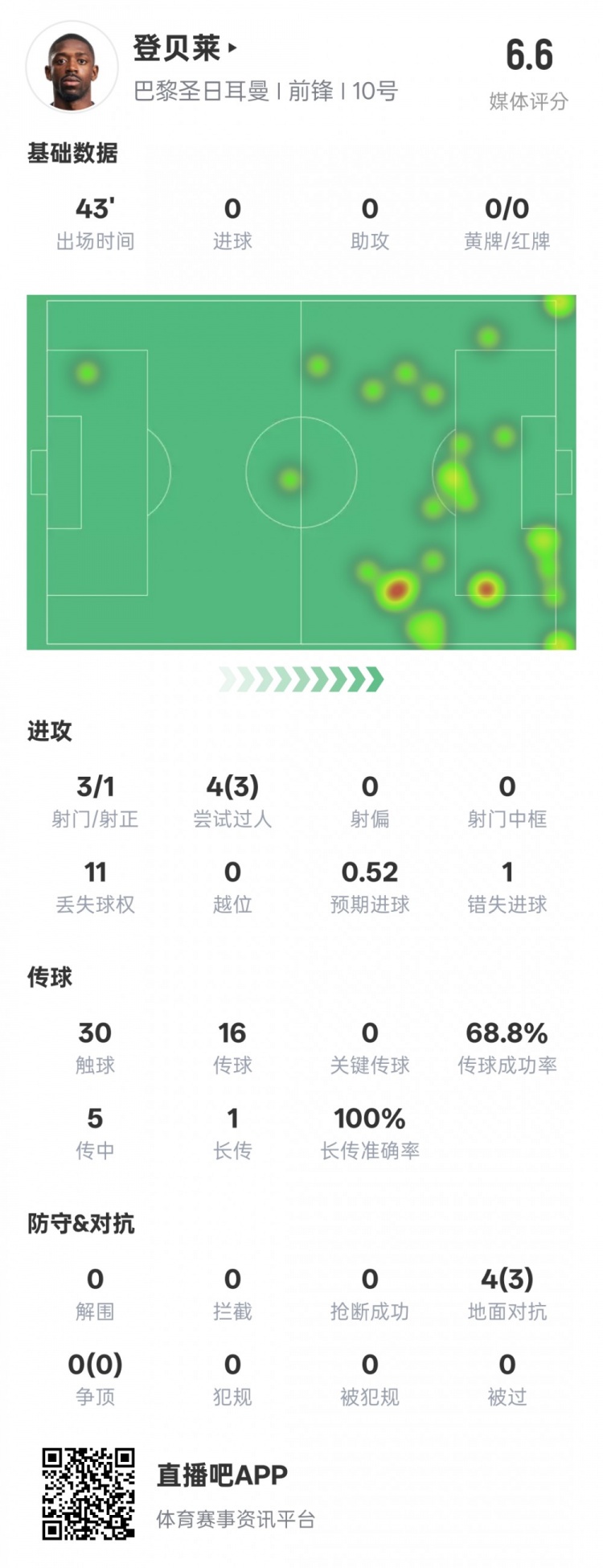 登貝萊半場(chǎng)數(shù)據(jù)如下: