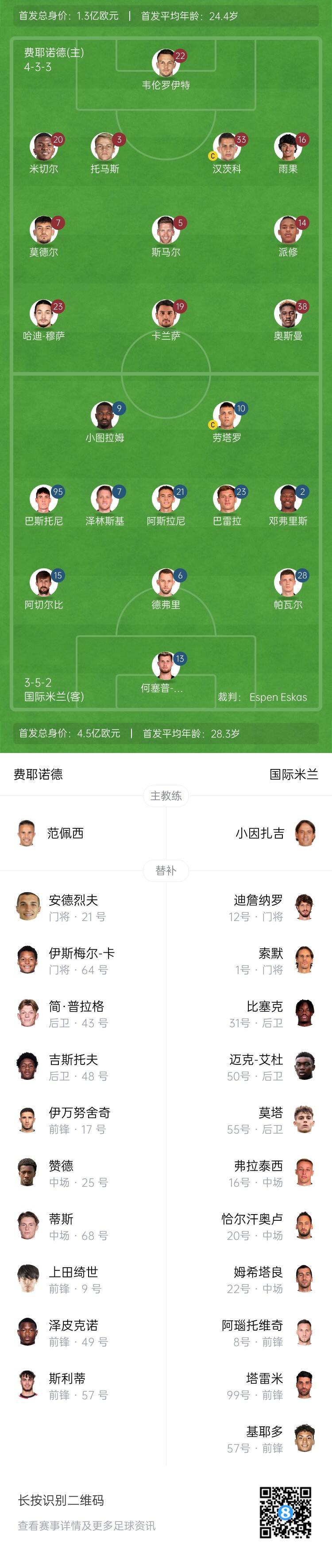 3月6日訊 歐冠1/8決賽首回合,國米客場對陣費耶諾德。賽前,官方公布了本場的首發(fā)名單。