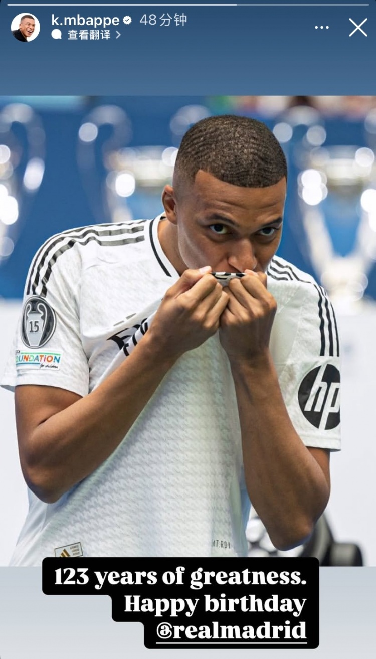 姆巴佩曬出自己親吻隊(duì)徽的照片,并寫道:123年的偉大歷史,生日快樂,皇馬。