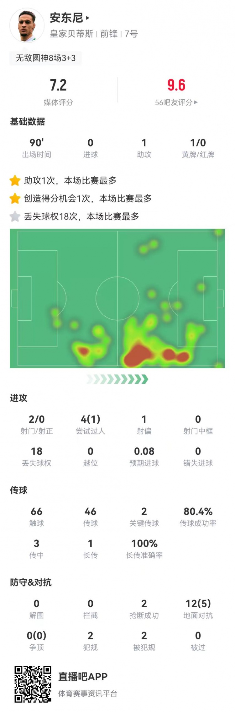 3月7日訊 貝蒂斯在本輪歐協(xié)聯(lián)2-2戰(zhàn)平吉馬良斯,曼聯(lián)租將安東尼本場數(shù)據(jù)如下: