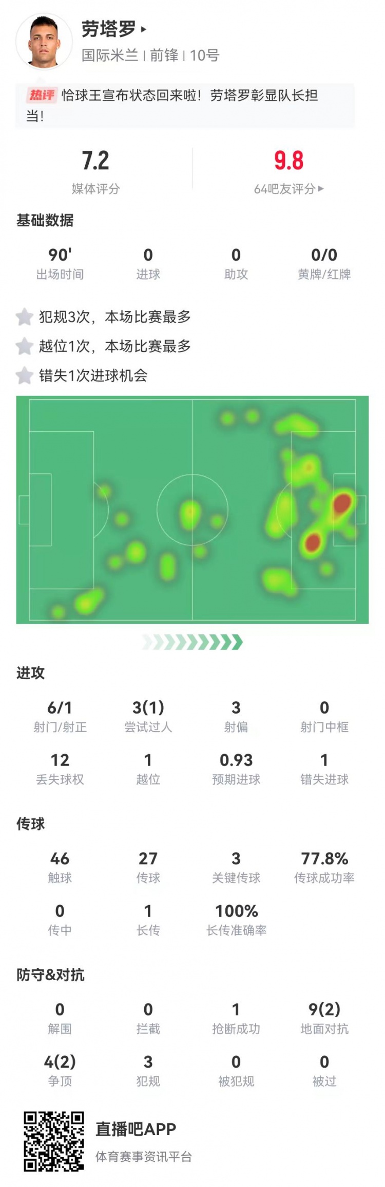 3月9日訊 國米在本輪意甲3-2逆轉(zhuǎn)蒙扎,勞塔羅本場數(shù)據(jù)如下: