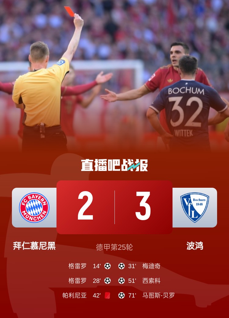德甲第25輪,拜仁2-3遭波鴻逆轉(zhuǎn)。上半場,格雷羅爆射破門,薩內(nèi)造點、格納布里失點,穆勒助攻格雷羅雙響,梅迪奇扳回一球,帕利尼亞直紅;下半場,西索科頭球扳平,貝羅反超比分。