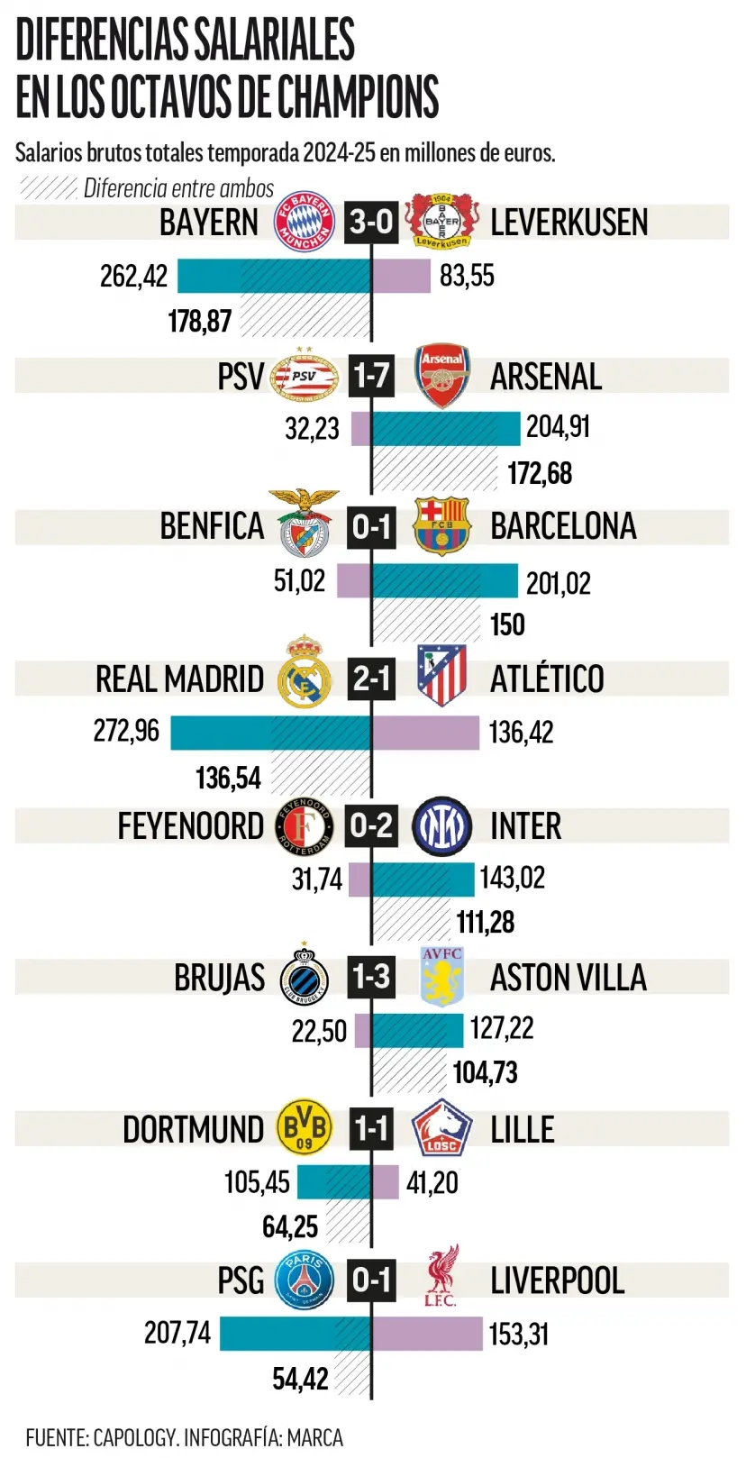 根據(jù)足球財(cái)務(wù)專(zhuān)業(yè)網(wǎng)站Capology的數(shù)據(jù),如果以球員薪資支出為標(biāo)準(zhǔn),最不平衡的淘汰賽是對(duì)陣拜仁和勒沃庫(kù)森的比賽,拜仁的薪資支出幾乎是對(duì)手的三倍(2.624億歐元對(duì)8350萬(wàn)歐元)。第二大差距出現(xiàn)在阿森納與埃因霍溫的對(duì)決中,阿森納球員的2.049億歐元薪資遠(yuǎn)超埃因霍溫的3220萬(wàn)歐元,差距高達(dá)六倍。第三個(gè)薪資差距較大的對(duì)決是本菲卡與巴塞羅那,巴薩球員的薪水是葡萄牙球隊(duì)的四倍(2.01億歐元對(duì)5100萬(wàn)歐元)?;蜀R與馬競(jìng)的陣容薪資差距恰好是兩倍,皇馬為2.729億歐元,馬競(jìng)為1.364億歐元。