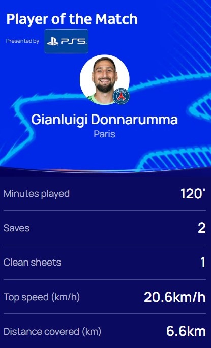 本場比賽巴黎門將多納魯馬發(fā)揮出色,在120分鐘時間做出2次撲救,并且在點球大戰(zhàn)中兩次撲出對手點球。
