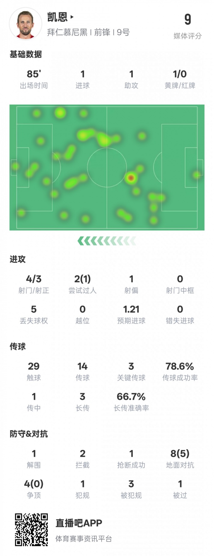 凱恩本場數(shù)據(jù):傳射建功+3關(guān)鍵傳球1過人成功,評(píng)分9.0
