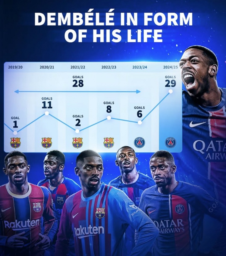 德轉(zhuǎn)數(shù)據(jù)統(tǒng)計(jì)顯示,登貝萊本賽季已經(jīng)打進(jìn)29球,而他此前5個(gè)賽季在俱樂(lè)部的總進(jìn)球數(shù)也才28球。