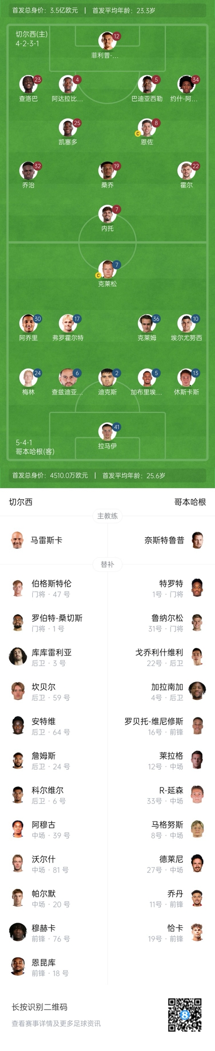 切爾西首發(fā):12-約根森、34-阿奇姆彭、23-查洛巴、4-阿達(dá)拉比奧尤、5-巴迪亞西勒、25-凱塞多、8-恩佐-費(fèi)爾南德斯、32-喬治、22-霍爾、19-桑喬、7-內(nèi)托