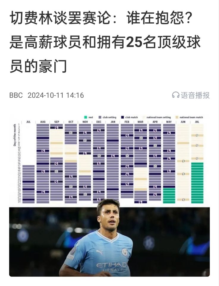 但對于這種抱怨,也存在相反的看法。比如歐足聯(lián)主席切費林曾在采訪回應(yīng),抱怨賽程最多的就是那些大俱樂部和高薪球員。但他們?nèi)找媾蛎浀母咝角∏【托枰銟凡慷嗵弑荣悂碇巍H绻麄儾辉笢p薪,那賽程縮減也很難辦。