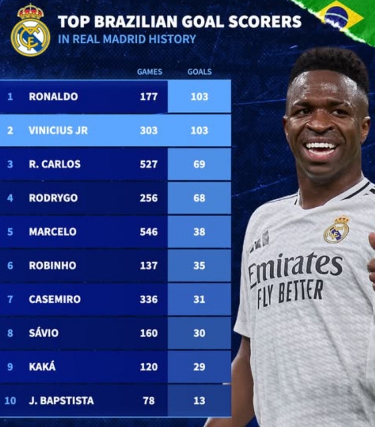 3月16日訊 《轉(zhuǎn)會(huì)市場》統(tǒng)計(jì)了皇馬歷史巴西球員進(jìn)球榜,大羅和維尼修斯均打進(jìn)103球并列最多。