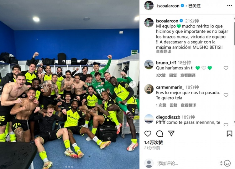 本場比賽伊斯科點(diǎn)射破門拉響反擊號(hào)角,賽后伊斯科也在社媒曬出更衣室內(nèi)全隊(duì)球員慶祝合影,配文寫道:“我的球隊(duì)????我們做到的事情值得被認(rèn)可,永不放棄太重要了。這是一場團(tuán)隊(duì)的勝利,現(xiàn)在是時(shí)候休息調(diào)整,以最高昂的斗志繼續(xù)前進(jìn)。貝蒂斯加油!
