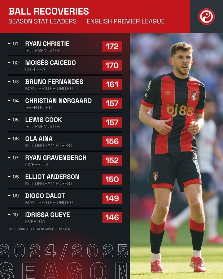 3月18日訊 國家隊(duì)比賽周到來,英超也暫時(shí)告一段落,squakwa統(tǒng)計(jì)了本賽季英超贏得球權(quán)情況,克里斯蒂居首。