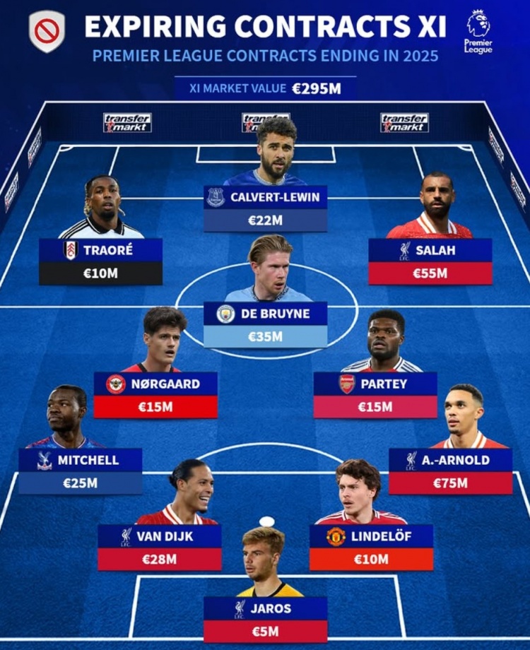 德轉列英超合同到期最貴陣:總身價2.95億歐元