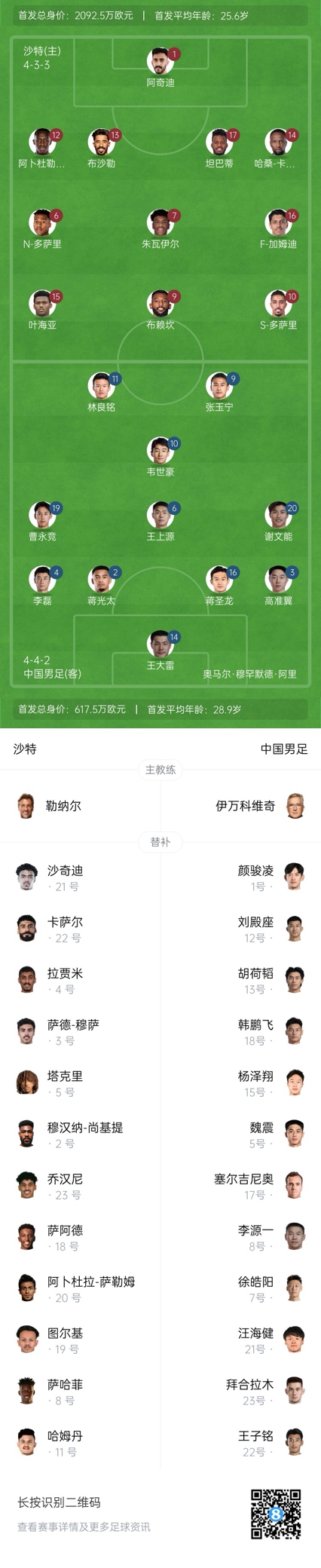 3月21日訊 世預(yù)賽亞洲區(qū)第三階段C組第7輪,中國(guó)男足客場(chǎng)挑戰(zhàn)沙特,賽前首發(fā)名單公布。