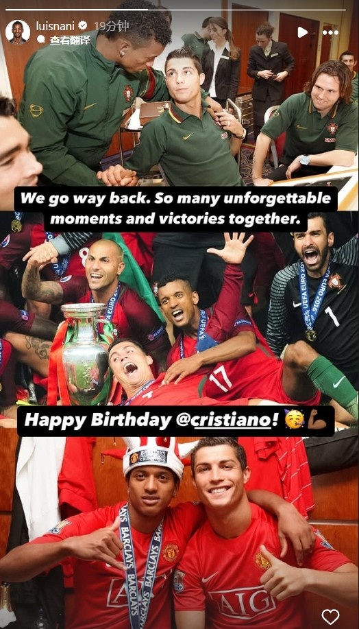 2月5日訊 今天是C羅的40歲生日,38歲的納尼更新動(dòng)態(tài),送上了祝福。