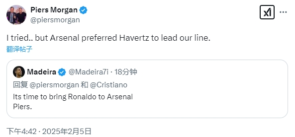 有球迷評(píng)論:“是時(shí)候把C羅帶到阿森納了,皮爾斯?!蹦Ω貜?fù):“我試過(guò)了……但阿森納更喜歡讓哈弗茨來(lái)領(lǐng)銜我們的鋒線?!?/p>