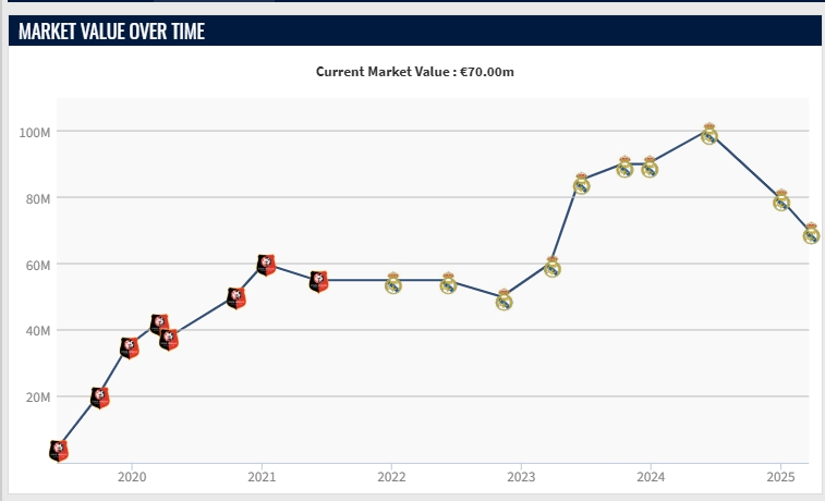 昨日德轉(zhuǎn)更新西甲球員身價(jià),22歲的皇馬中場卡馬文加再降1000萬,最新身價(jià)為7000萬歐。