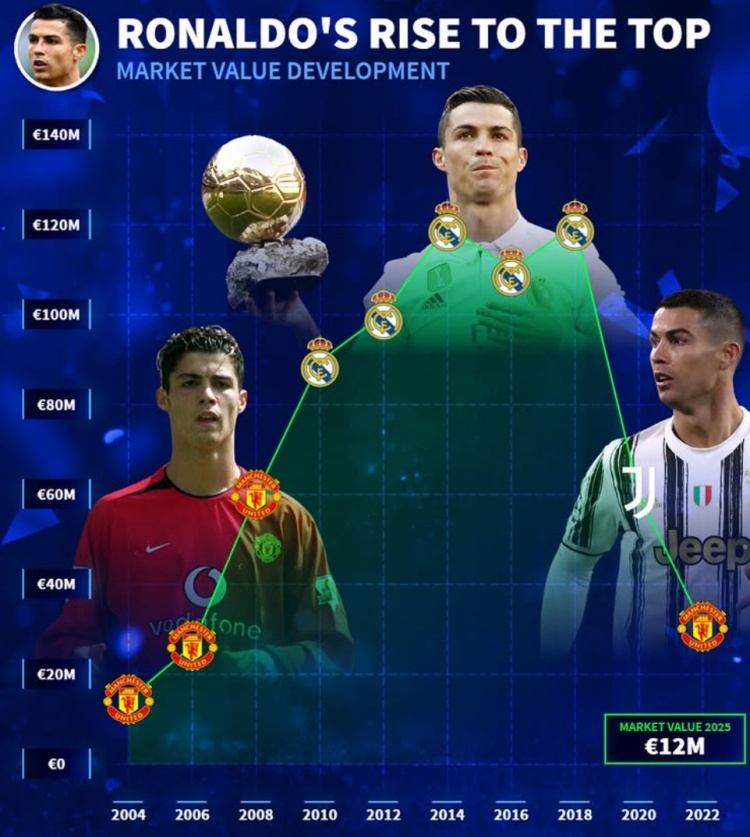 德轉(zhuǎn)列C羅生涯身價變化:皇馬時期兩度1.2億歐,當前1200萬歐