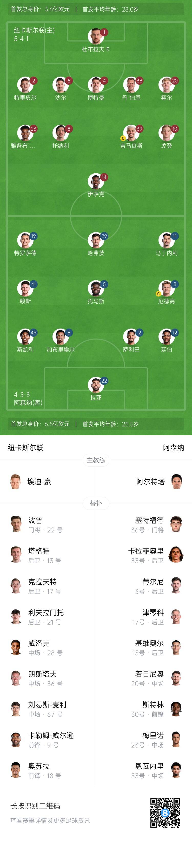 紐卡首發(fā):1-杜布拉夫卡、2-特里皮爾、4-博特曼、5-沙爾、33-丹-伯恩、39-吉馬良斯、8-托納利、20-霍爾、23-墨菲、14-伊薩克、10-戈登