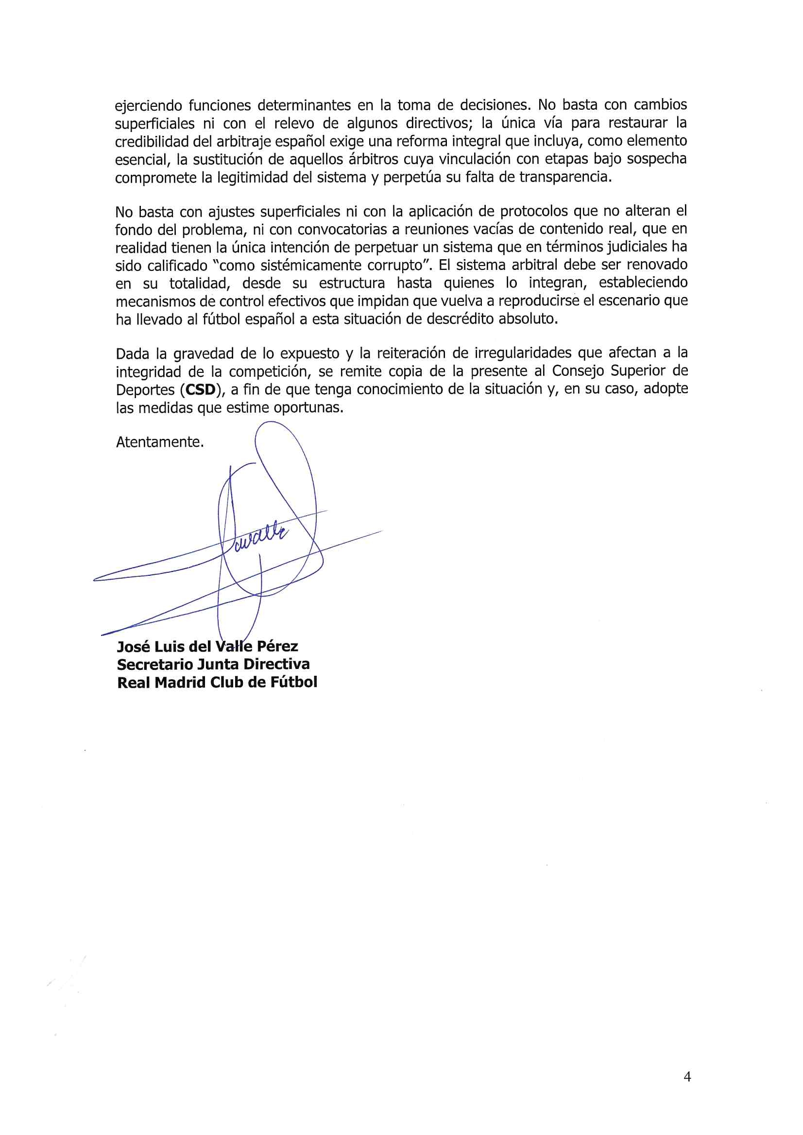 當(dāng)?shù)貢r(shí)間2月3日,皇馬正式就近期的爭(zhēng)議判罰正式向西班牙皇家足球聯(lián)合會(huì)提出對(duì)裁判系統(tǒng)和VAR操作的系統(tǒng)性不公指控,并抄送西班牙高級(jí)體育理事會(huì),皇馬俱樂(lè)部董事會(huì)秘書(shū)José Luis del Valle Pérez簽署了投訴函。