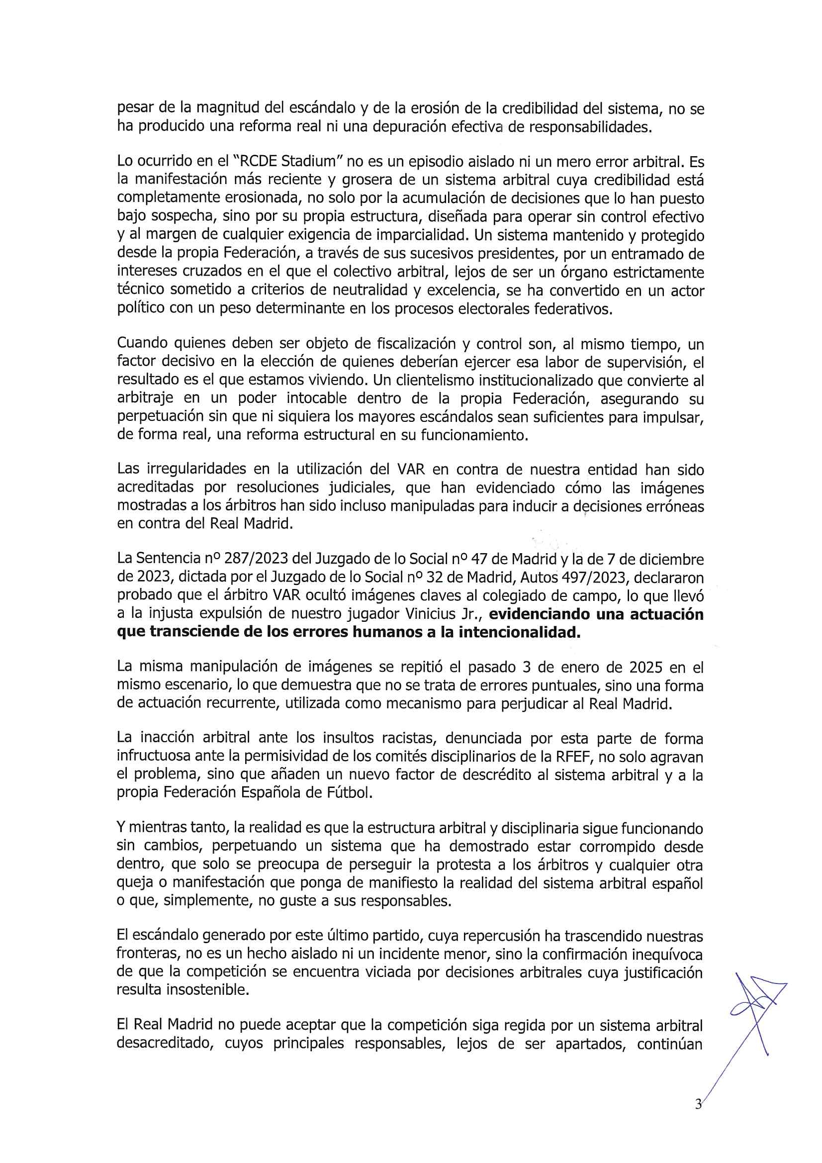 皇馬不能接受比賽還在一個(gè)失去信譽(yù)的仲裁制度下進(jìn)行。該制度主要負(fù)責(zé)人并未被撤職反而持續(xù)在決策中起著決定性作用。光靠表面上做些改動(dòng)或更換幾位高管是不夠的;恢復(fù)西班牙仲裁公信力唯一途徑就需要全面改革包括替換那些與嫌疑階段有關(guān)聯(lián)、影響到系統(tǒng)合法性并使其缺乏透明度持續(xù)存在問(wèn)題的裁判們。