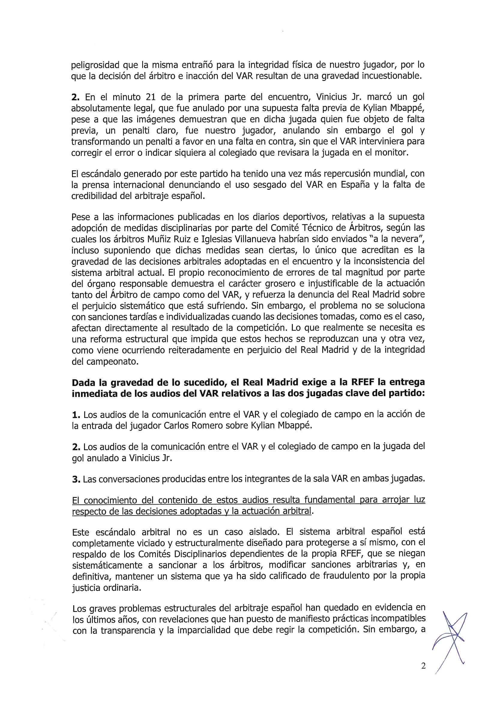 馬德里第47社會(huì)法庭的判決書(shū)編號(hào)287/2023,以及由馬德里第32社會(huì)法庭于2023年12月7日發(fā)出的判決書(shū),案件編號(hào)497/2023,證實(shí)了VAR裁判員向現(xiàn)場(chǎng)裁判員隱瞞關(guān)鍵影像的事實(shí),這導(dǎo)致我們的球員維尼修斯被不公正地罰下場(chǎng)。這一行為超越了人為錯(cuò)誤范疇,顯示出其有意為之。