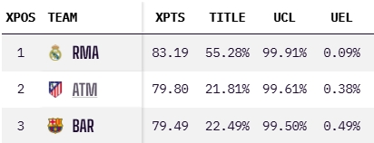 機(jī)構(gòu)目前預(yù)測本賽季最終皇馬積分將達(dá)到83分,馬競和巴薩均為79分。