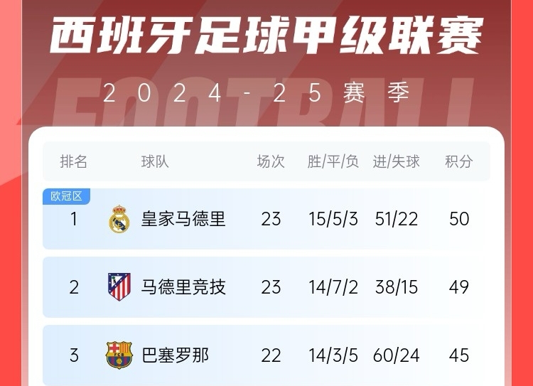 02月09日訊 西甲第23輪馬德里德比戰(zhàn)成1-1,這使得榜首三隊(duì)的爭冠形勢更具懸念。