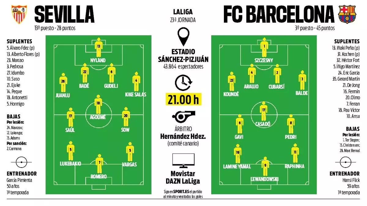 2月9日訊 據(jù)西班牙《每日體育報》報道,巴薩將在本輪西甲聯(lián)賽中客場挑戰(zhàn)塞維利亞,萊萬多夫斯基和加維將回到首發(fā)陣容中。