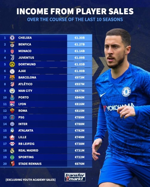 過去10個(gè)賽季各俱樂部賣球員收入排行:切爾西13億歐穩(wěn)居第一