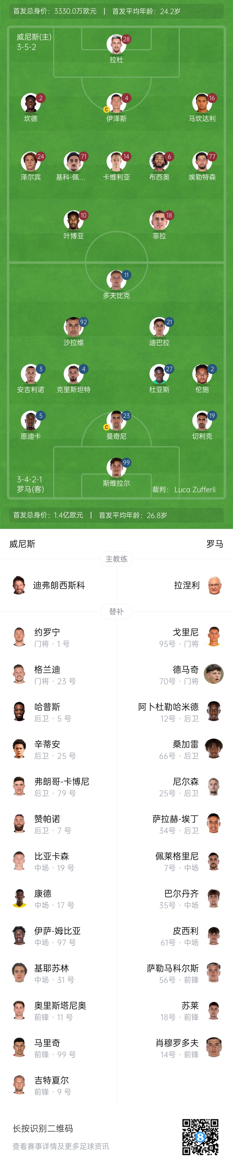 威尼斯替補(bǔ):1-約羅寧、23-格蘭迪、5-哈普斯、25-辛蒂安、79-弗朗哥-卡博尼、7-贊帕諾、19-比亞卡森、17-康德、97-伊薩-姆比亞、31-基耶蘇林、11-奧里斯塔尼奧