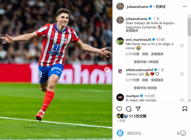 阿爾瓦雷斯社媒曬照,阿根廷門將大馬丁留言調侃道:“如果你敢這樣對我,我會追著你跑?!?/p>