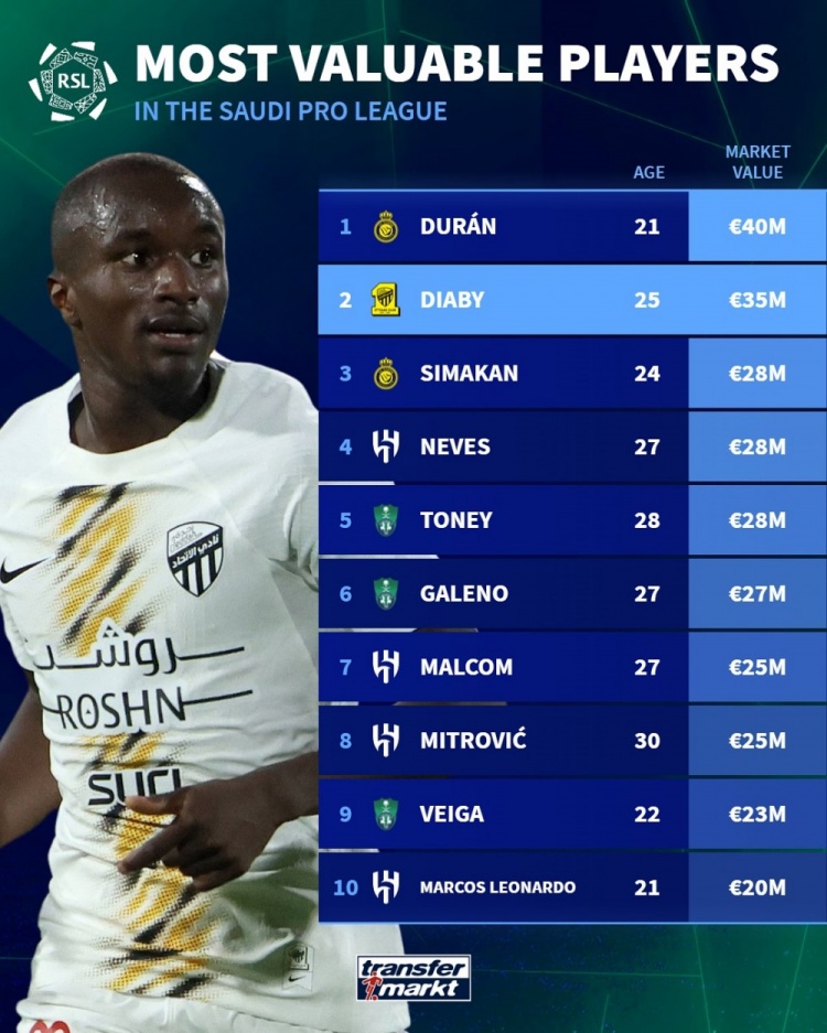 沙特聯(lián)賽德轉(zhuǎn)身價(jià)榜:杜蘭4000萬(wàn)歐居首,前10名利雅得新月占4席