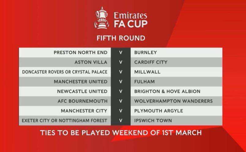足總杯16強(qiáng)抽簽出爐,曼聯(lián)將對陣富勒姆,曼城將對陣普利茅斯,紐卡將對陣布萊頓。