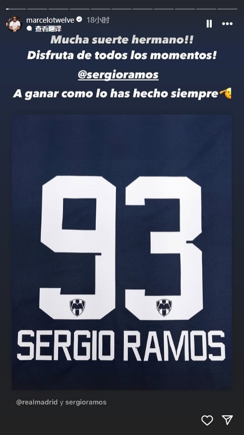 2月11日訊 38歲西班牙中衛(wèi)拉莫斯自由身加盟蒙特雷,身披93號(hào)球衣,前皇馬隊(duì)友馬塞洛社媒為他送上祝福。