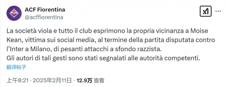 佛羅倫薩聲明:小基恩遭到嚴(yán)重種族主義攻擊,已報(bào)告相關(guān)當(dāng)局